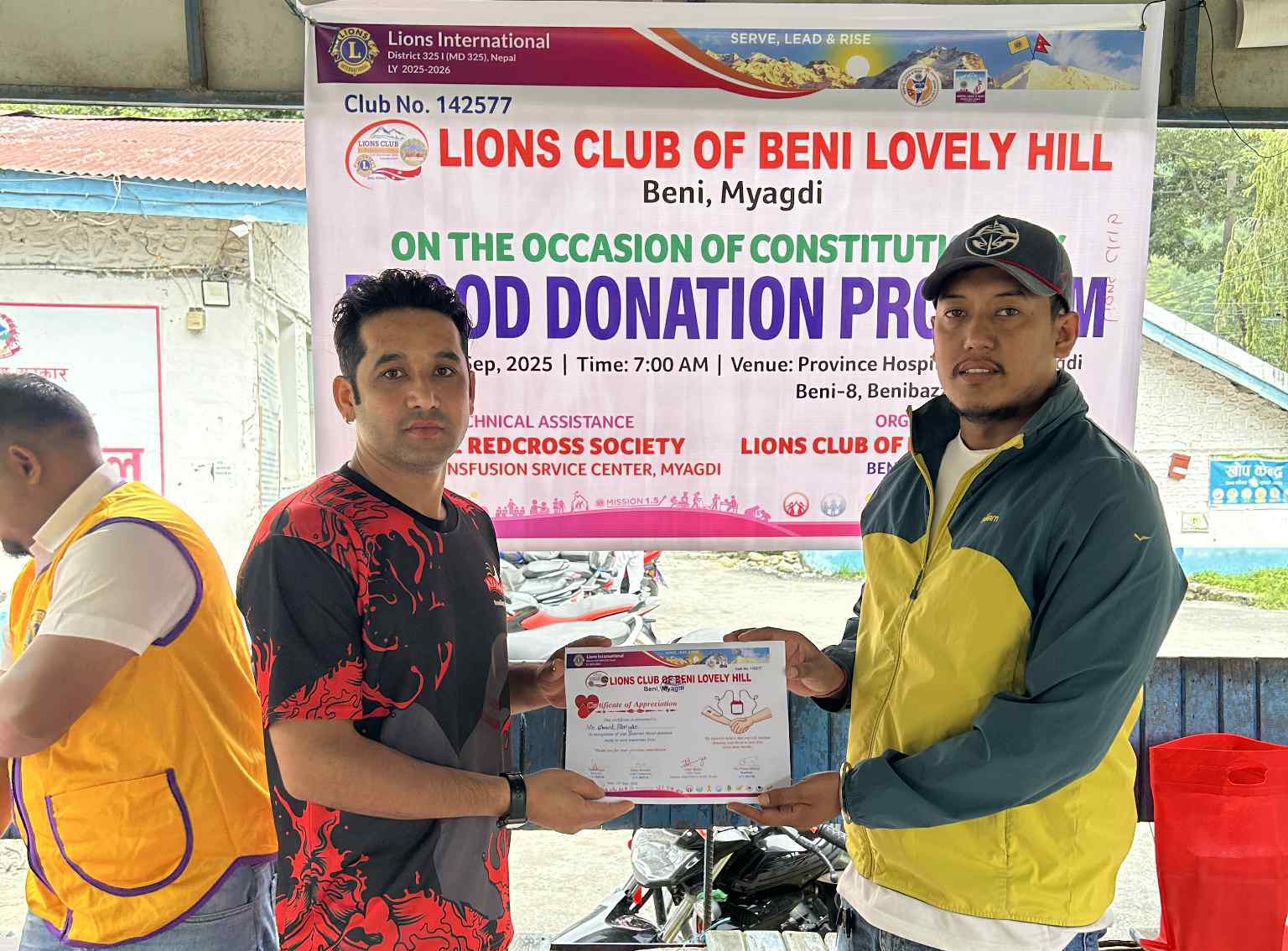 जेन्जी आन्दोलनमा विभिन्न अस्पतालमा रहेका घाइतेको उपचारमा रगतको अभाव नहोस् भनेर लायन्स क्लव अफ बेनी लभ्लीहिलले सदरमुकाम बेनीमा रक्तदान कार्यक्रमको आयोजना गरिएको छ । संविधान दिवसको अवसरमा प्रदेश अस्पताल बेनीमा क्लवले आयोजना गरेको रक्तदान कार्यक्रममा २४ पिन्ट रगत सङ्कलन गरिएको हो ।