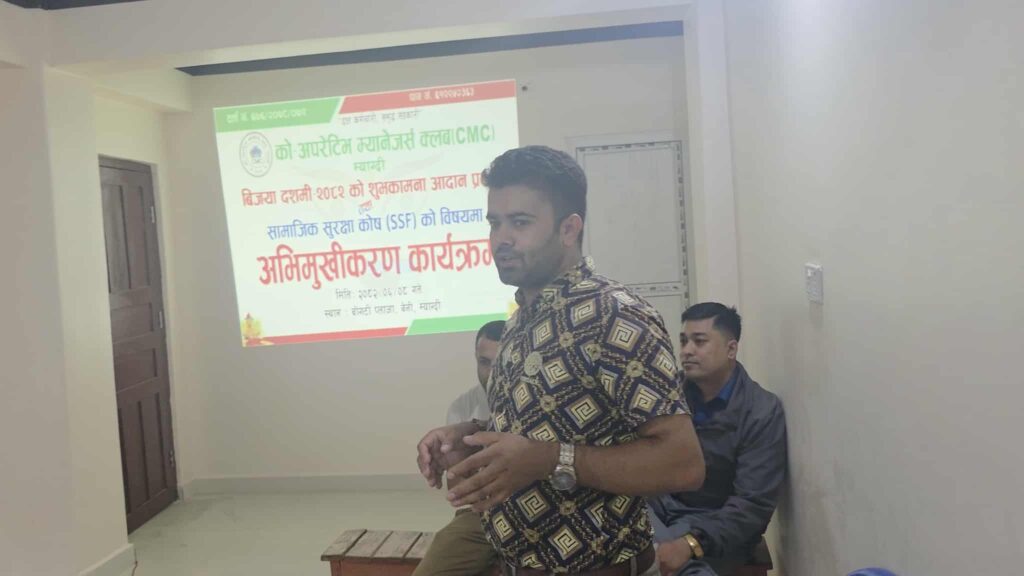 म्याग्दीमा रहेका सहकारीहरुका प्रबन्धकहरुलाई एक दिने सामाजिक सुरक्षा कोषको बारेमा अभिमुखिकरण कार्यक्रम सम्पन्न भएको छ ।को–अपरेटिभ म्यानेजर्स क्लब (cmc) म्याग्दीले सहकारीका कर्मचारीहरुलाई पनि सामाजिक सुरक्षा कोषमा सहभागीता बनाउने उदेश्यले आयोजना गरेको कार्यक्रममा म्याग्दी र पर्वतको जलजला गाउँपालिका सहित २१ जनाको उपस्थिति रहेको थियो ।
