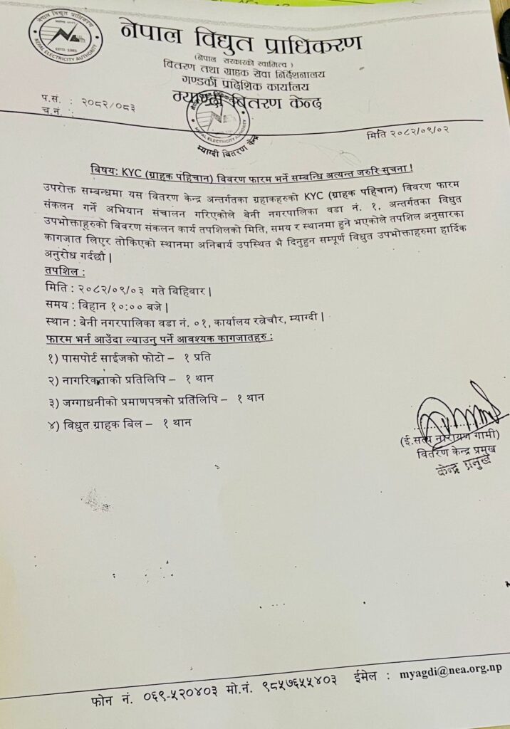 नेपाल विद्युत प्राधिकरण म्याग्दी वितरण केन्द्रले बिहिबारबाट उपभोक्ताहरुको KYC विवरण संकलन गर्न सुरु गरेको छ । जिल्लाको बेनी नगरपालिका–१ रत्नेचौरबाट उक्त कार्यको सुरु गरिएको म्याग्दी वितरण केन्द्रका प्रमुख सत्य नारायण गामीले जानकारी दिनुभयो । उहाँका अनुसार उक्त कार्यक्रममा १५० जना ग्राहकहरूको केवाईसी विवरण संकलन गरिएको छ । उक्त कार्यक्रममा विद्युत प्राधिकरण म्याग्दी वितरण केन्द्रका कर्मचारीहरु नै पुगेर उपभोक्ताको केवासी संकलन गरेका थिए ।